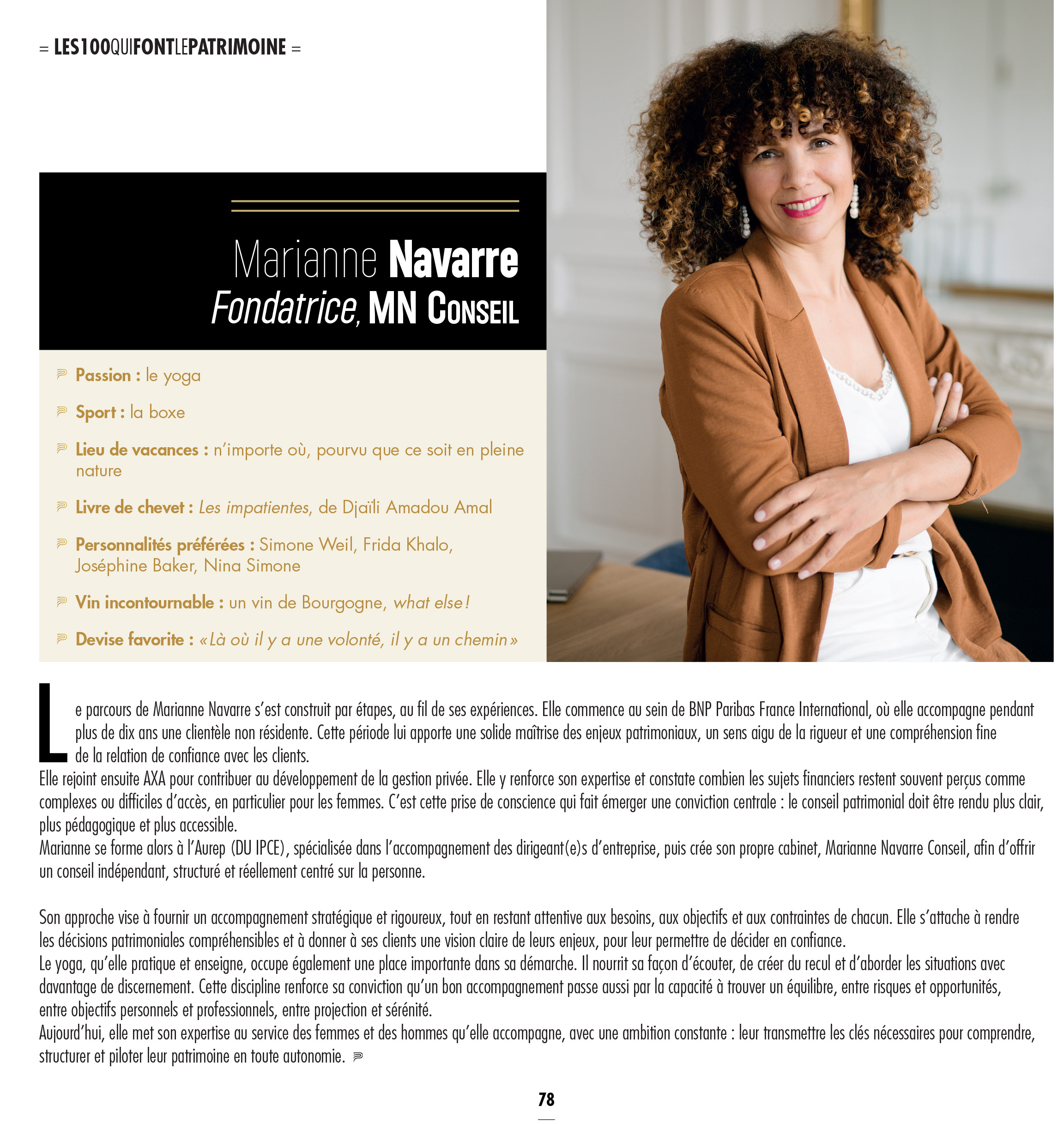 Forte de mes valeurs et de mes convictions, je décide de créer le cabinet « Marianne Navarre Conseil » pour désacraliser le métier du conseil patrimonial.